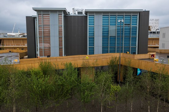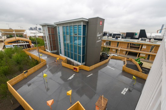 The pavilion, which covers an area of 4.432 square meters, combines industrial elements and tradition and is a project by studio Netwerch GmbH Brugg. While the towers, acting as deposits, recall the world of technology and machinery, the wooden terrace and buildings with gabled roof allude to the traditional Swiss villages. Much of the Swiss pavilion provides open access areas in which visitors can move around freely, while there is a ticketing system for accessing the food towers located in the center.