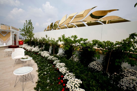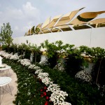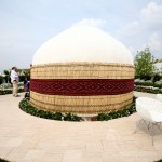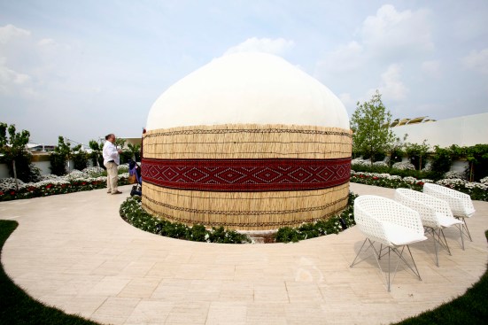 This 1,500-square-meter pavilion by Tilke Engineers and Architects showcases the country’s traditional handcrafted carpets both inside as display items and as part of its exterior design. A traditional yurt-style lodging tops the structure while its three-story interior references the white marble buildings for which the country’s capital, Ashgabat, is known.