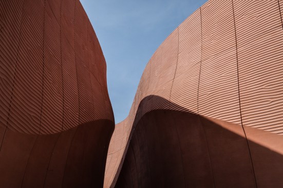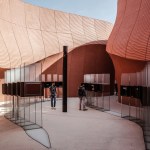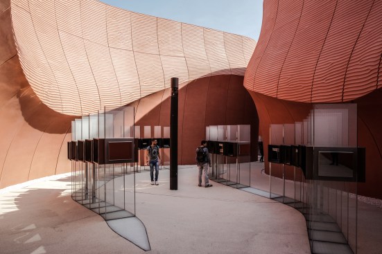 Tall, undulating walls that reference the United Arab Emirates’ (UAE’s) narrow streets and vast desert dunes guide visitors through the site, designed by London-based Foster + Partners, while interactive media displays explore the country’s agriculture and food-production industries. Following the Expo’s close, the pavilion will be re-assembled at Madsar City, a low-carbon, energy development campus in the UAE.