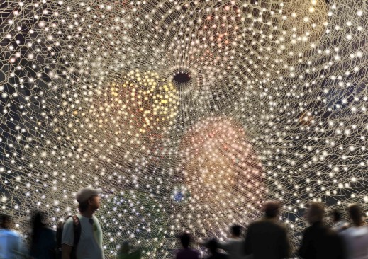 As visitors make their way though the meadow they will gaze upon the hive in the distance. It glistens like a beacon on the horizon, much like the sun enabling life on earth. The structure is inspired by and stands as an abstract reinterpretation of the architecture of bees. Key attributes of the honeycomb have been expressed: translucency, topology, geometric variation, and distribution of multiple functions, layers. These have been re-composed in a new way, using artifice to draw out these intrinsic qualities. Throughout the creative process it has been important to create something that suggestions traces of the key ideas and content; yet open to interpretation, leaving ample room for personal subjectivity to engage in the experience.