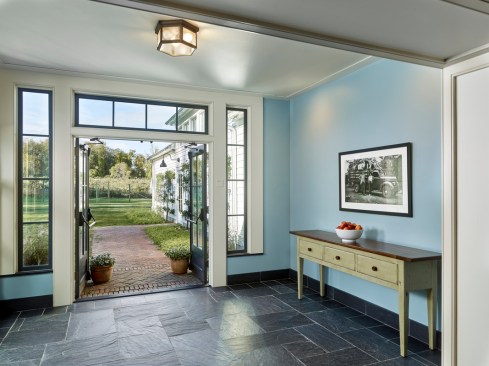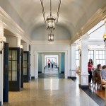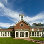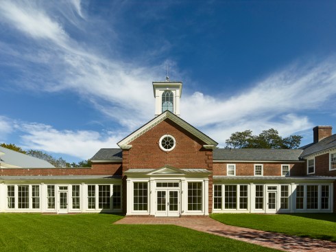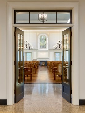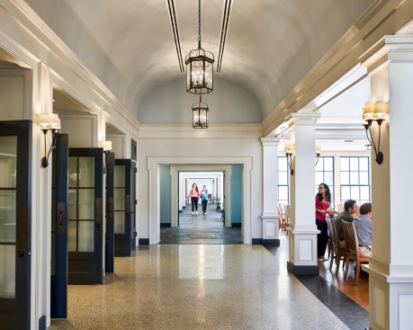 A glazed gallery and cupola over the main entry connect the original dining hall with the new while forming a focal point for the court. The original dining room has been transformed into the campus living room and is used to host faculty and trustees' meetings, special dinners and other events. The courtyard is for outdoor dining.