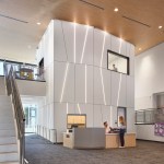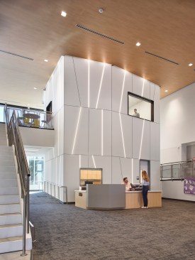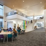 Visible from the exterior, a glass-encased prism in the library encapsulates the school’s mission. The intersection of science and art is expressed in this focal point, whose shape echoes mathematical principles and the geometry that makes up our entire world. The student commons, science and art labs, and performing arts spaces branch off from this central core. Both the articulation of shape and color are a nod to the science of color and light. Accents of cyan, magenta, and yellow reflect the overlapping of the colors that create light. The same bright colors differentiate the classroom corridors for each grade level, easing wayfinding and reinforcing the design language established by the prism at the heart of the campus.