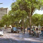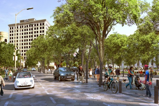 To break down the barriers between Miller Park and the existing Miller Plaza across the street, SMM/EDR applied a “shared street” approach and reconfigured Martin Luther King Boulevard, connecting the two public spaces as one unified civic space. This involved reducing traffic lanes, removing traditional curbs to bring the road and sidewalk to the same level, and planting a flush median strip with native trees to slow down traffic and encourage more pedestrian activity across the entire park.