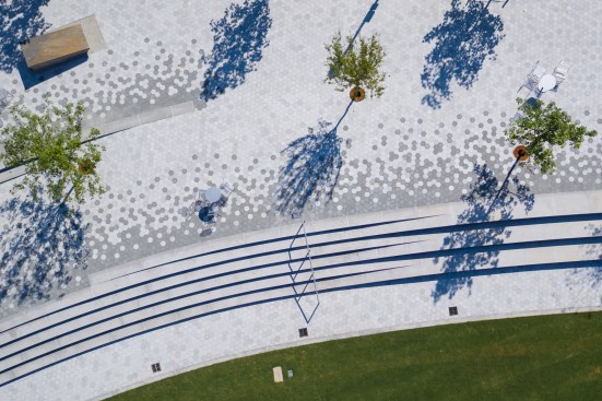 A paving pattern marks the transition between the park and the roadway, with this design continuing along the monumental stairs intended for social gatherings. These steps play a leading role in the design of the park, and easily transform into seating for everyday use and special events.