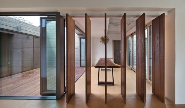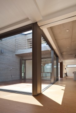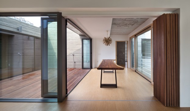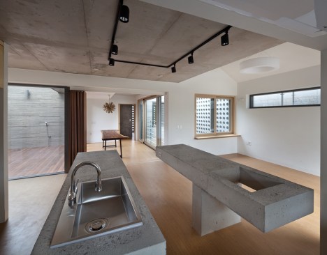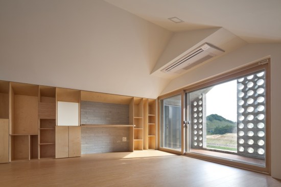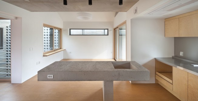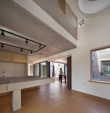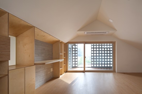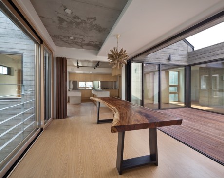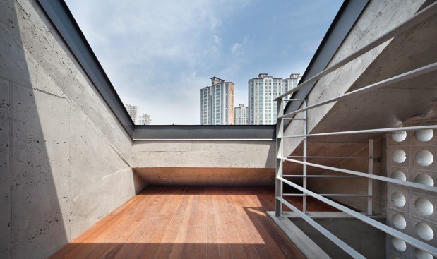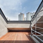 The building site that is located in the Innovation City is located in the T intersection. The location of shopping mall is good, but for the location of the house is unsecure of the privacy. To solve this problem, we use the cube block as a screen device on the residential sector. As a commercial building, at night, it had an unique lighting feeling and gaining awareness became an advantage. Also, it’s located about 15m lower side of the road and the opposite side has an advantage of the view of urban landscapes and mountains. Considering this surroundings, at the 1st floor was external court and the entire floor was glass mass to give an enjoyment to the users. But, the biggest problem is that if the street block is form as a commercial type house only, then the 2nd floor and 3rd floor has a problem of lighting. A house should to be bright and naturally ventilated to maintain comfort. To secure the privacy of 1st to 3rd floor to the south, we formed a cube block as a screen device and on 3rd floor, we made sky garden in external court for the lighting and natural ventilation. Especially, on 3rd floor, between 2 external court can be a living room, dining room, or home bar and by placing a wall in kitchen, it can be an independent space or one space. Also, in this multi-purpose space, we installed a folding door around the external court to make as a another one space. The kitchen is the center space when the owner of third floor generation comes. The kitchen communicates with the sky garden, multi-purpose space, and living room. The attic separates the 2 areas into 2 spaces and make as a connecting passages. This connecting passage connects the attic with the bridge between the external court and the external deck and connects with the sky garden too. Through the center of the sky garden, various spatial program can be form and hopefully there will be new ways of communicating amongst family members too.