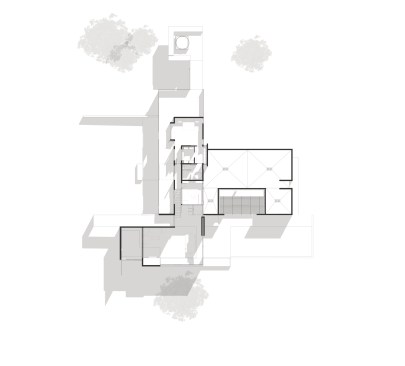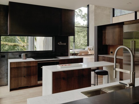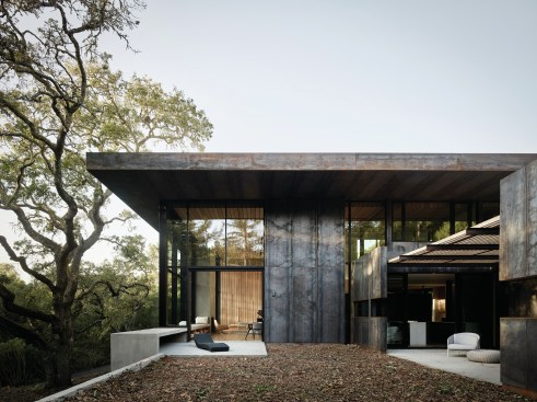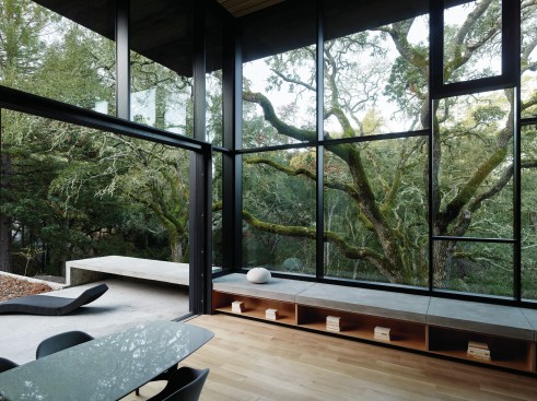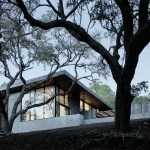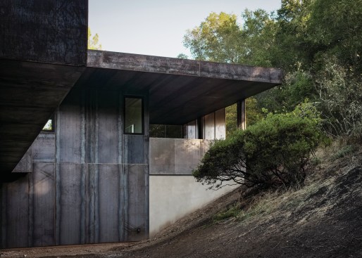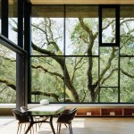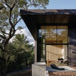 The clients are a couple of environmental scientists who, along with their two sons, relocated from the Oakland Hills to the warmer climate of Orinda. Their commitment to sustainability, including a request for net-zero energy performance annually, was evident in their thinking throughout the design process. A three-bedroom program began as a remodel of a 1954 ranch house at the foot of a hill next to a seasonal creek. After finding the existing structure and soils to be unsuitable, the direction settled on reusing the existing footprint under the shade of a Valley Oak that had grown up close to the original house. The surviving portion of the original house is the fireplace which was wrapped in concrete and utilized for structural support. This made additional grading unnecessary and allowed the new house to maintain the same intimate relation to the old oak.