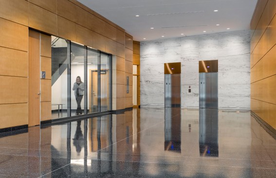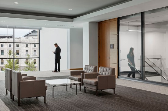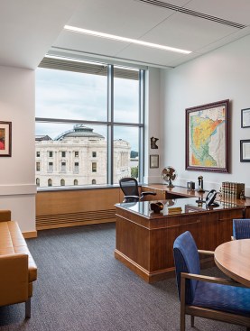 Arcing along the radius of the Capitol’s dome, the building’s massing gently curves to maximize views back to the Capitol. At nearly five-stories with approximately two levels of below-grade parking across its sloped site, the building is considered an extension of the Capitol with offices and support space for state senators and their staff, three large public hearing rooms, and several departments supporting the legislative process. Glass facades along its southern exposure allow for the optimal use of daylight throughout the building to create an enriching, productive workplace.