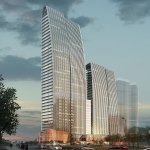 An efficient footprint is derived from the shape of the site’s buildable area, which is elongated in the east to west direction. The shearing of the main tower forms into two equal parts serves to create an underlying tension between the two masses and breaks down both the north and south facades of each tower into smaller pieces.