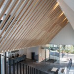 By attaching long pieces of cedar and larch, we added a rhythmic variation to the ceiling and the wall. The space was further enlivened by the passing of light through the ceiling like komorebi, or light filtering down through the trees in a forest.