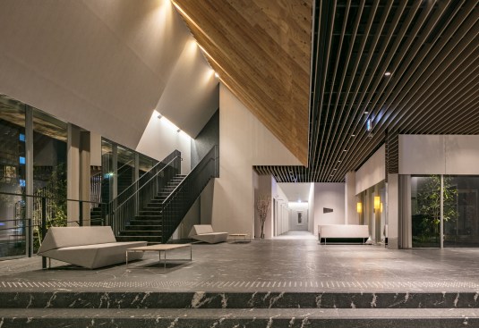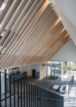 We didn’t want a building like a closed box, so we placed the entire structure under a sloped roof to express the space like a well-preserved forest.