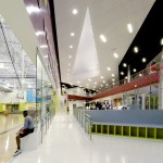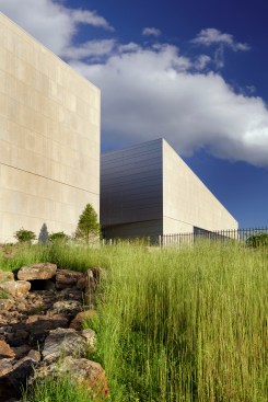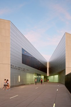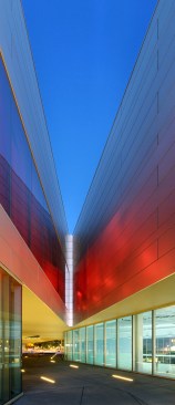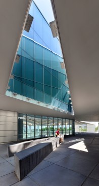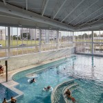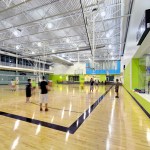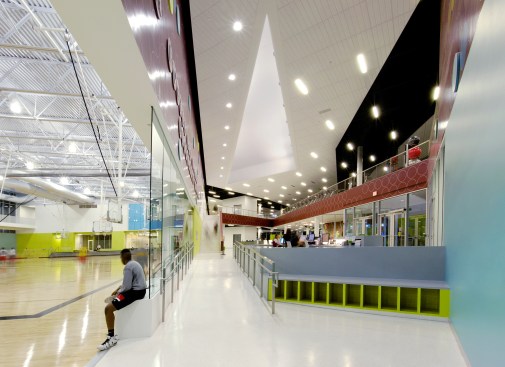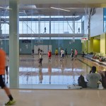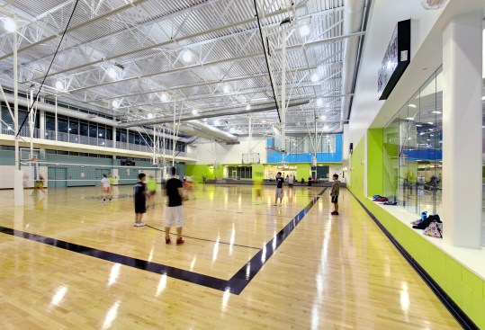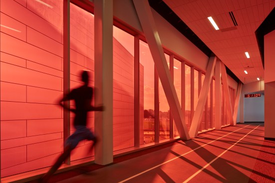 The new recreation center unifies two major campus precincts thanks to a unique design allowing the passerby to experience program activities without even entering the facility. The building is conceived as a crystalline geode with the stone shell – referencing the historic stone buildings that define the campus – cut away to reveal a cool metal and glass interiors, exposing the vibrancy of student life and recreation. This unique ‘cut” creates a dynamic three-dimensional space while still allowing pedestrian circulation to flow freely across campus. This design unites the campus and also creates a new symbol for health and wellness on campus.