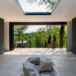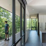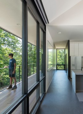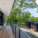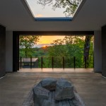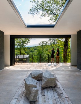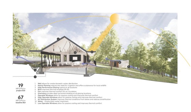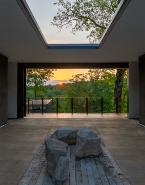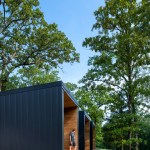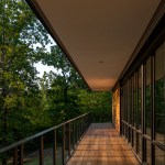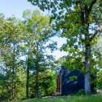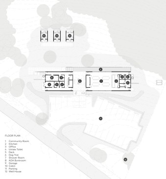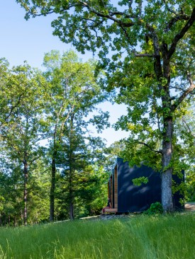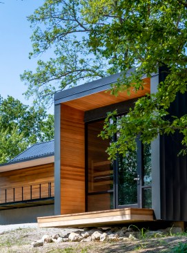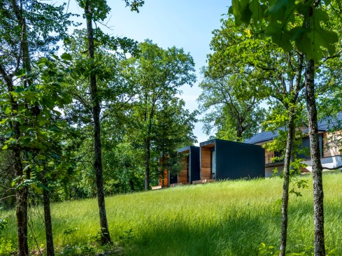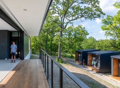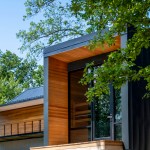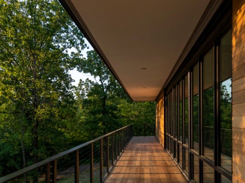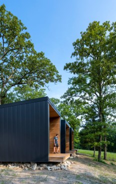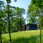 The MSU Ozarks Education Center provides sleeping quarters, a dining center, residential kitchen, classroom space, and room for programs to help support the pursuit of education and research for MSU faculty and students, other universities, high school students, and non-profit organizations. A focal point of connection is the facility’s dogtrot which serves as a point of entry for the main building and a threshold for visitors to begin a day of ecological study at the MSU Ozarks Education Center. The dogtrot divides the main building into community space and residential space. Designed on an east/west orientation to accommodate the site, the main building connects visitors to the natural environment by way of the dogtrot, opening up the heart of the facility to views of sunrise and sunset. A roof oculus located within the dogtrot space also orients visitors to the surrounding site, creating connections to both sky and earth, and allowing water to come into the space. The dogtrot is equipped with large barn doors for passive cooling that can be closed down as needed to protect against harsh weather conditions. Three individual cabins are located down the site’s slope from the main building. Nestled into the trees, these cabins also focus on the multi-sensory experience of natural elements, such as light, air, and water. Large apertures of glass offer immersive views of the surrounding forest and passive cooling strategies are implemented through operable windows.