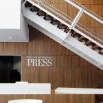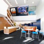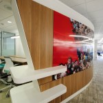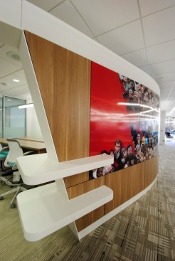 The main body of space is cradled by an undulating media wall. This wall contains tools for collaboration including white board, projection, and LCD monitors. It supports small group to large group interaction. Furthermore, the wall reflects the heritage and brand of the company by including large artistic photographs produced by our client. The wall immerses the space in an artistic brand experience while providing a very active engagement area.