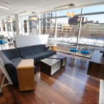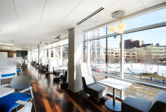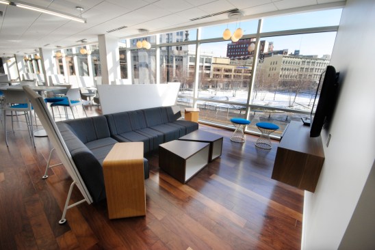 Hospitality zones are integrated throughout to promote comfort, lingering and friendly interaction that revitalize. They offer areas to re-posture, supporting long active hours of work and casual brainstorming. Technology and tools are integrated to provide a work any place, anytime vibe.