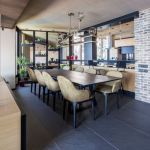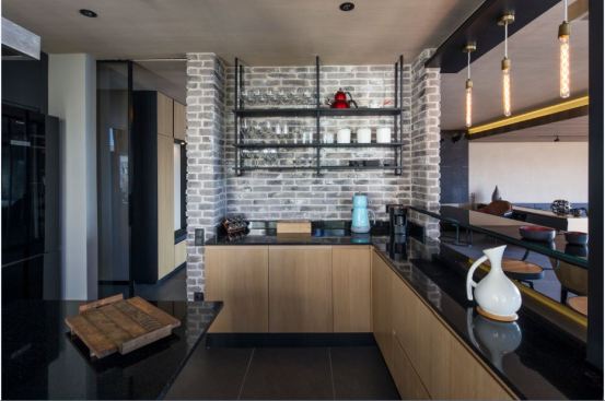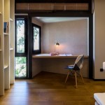The masculine style of the house is maintained with different styles and varnishes of oak wood, alongside the usage of neutralized tones of brick walls and dark metal finishing. The contrast of the house is maintained by dark coloured frames and details. The minimal usage of copper on the lighting fixtures has enhanced the diversity.