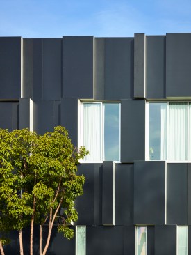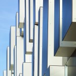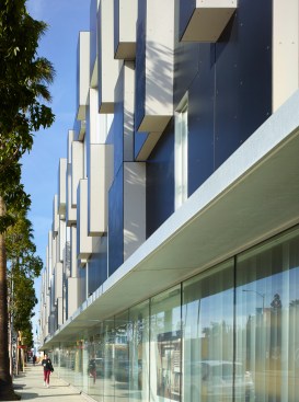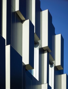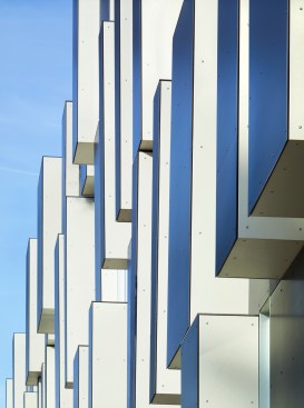 Functionally, the award-winning façade serves as a rain screen, insulation to the building surface from the sun, and as an acoustic diffuser for the city’s main artery.