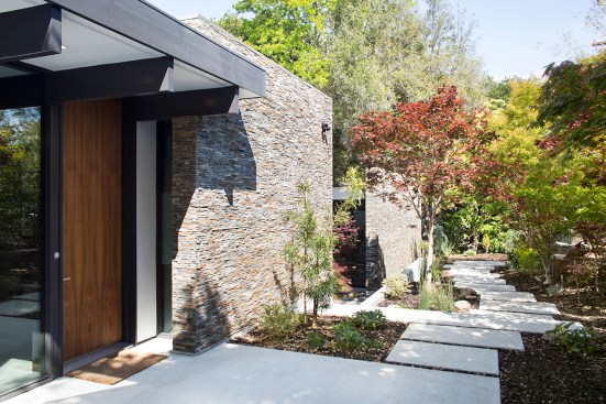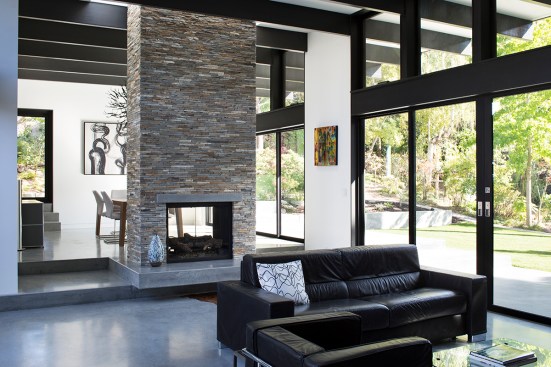 up ahead of the rear yard through a large glass wall. As the sloping site drops