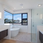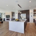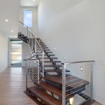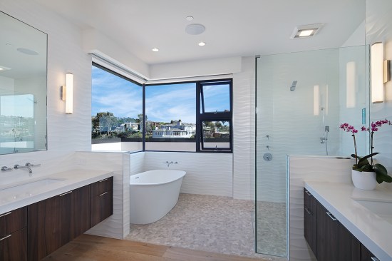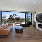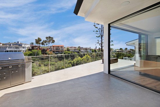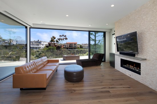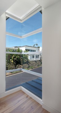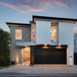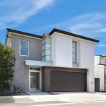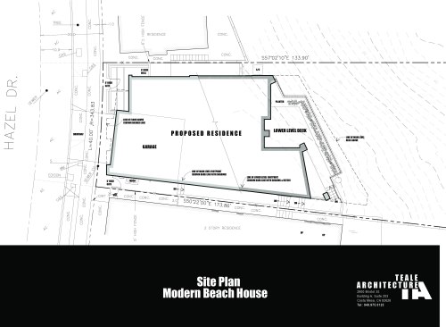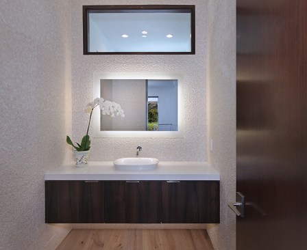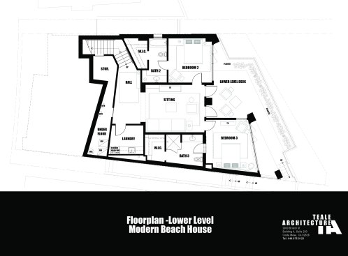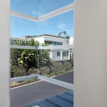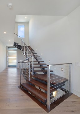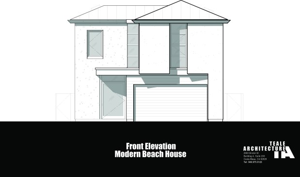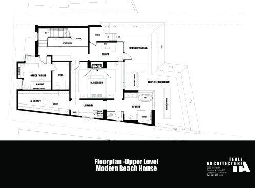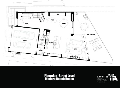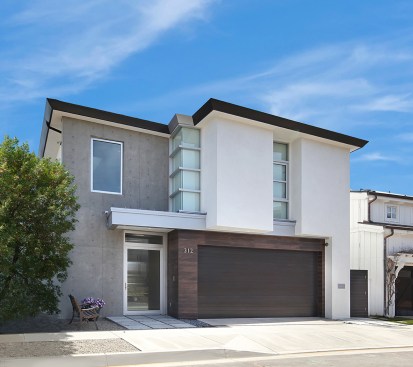 A short building pad drops off to a steep canyon that makes the building footprint very small and necessitates an open plan to achieve spaciousness and enjoy the views of the canyon. The client is a concrete subcontractor so we made the feature wall panel at the entry door poured in place concrete. His office looks back down the one way street from a corner glass window above the entry. This makes spatial tension as the entry concrete wall and the dissected white plaster box over the garage are held apart with the corner glass. The entry canopy is a focal point because it appears as a cantilevered metal beam holding up the box over the garage. The hip roof, angled gutter / fascia, punched window are familiar, however, the office box over the garage is skewed telling you that angles exist….formed by the string line between existing structures on the canyon as required by the California Coastal Commission.