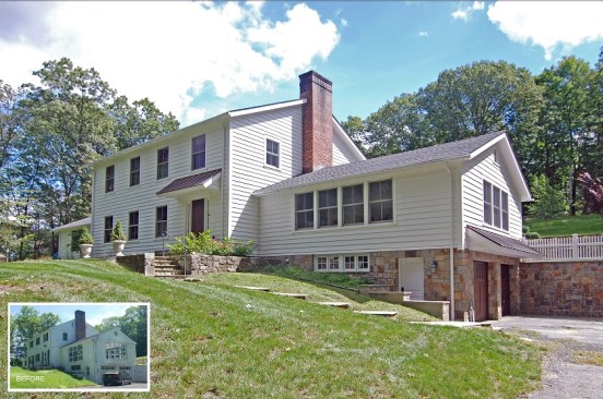 The existing house, a 2 story Colonial built in the ‘50’s – dated inside & out. We completely gutted both floors, reconfigured & remodeled. We removed & replaced the roofing, siding, trim, windows & doors.