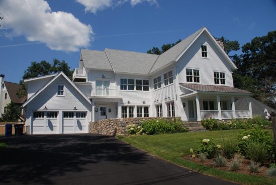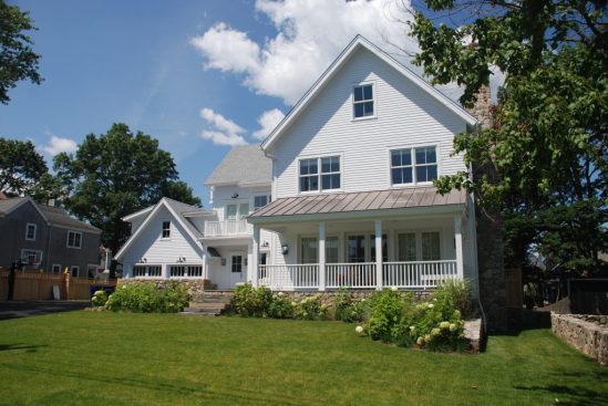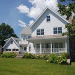 Exterior materials consist of cedar clapboard siding, asphalt shingle roofing, standing seam copper roofing & PVC trim.