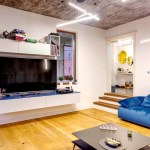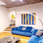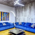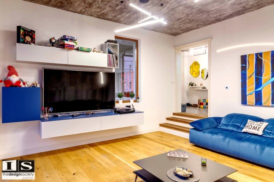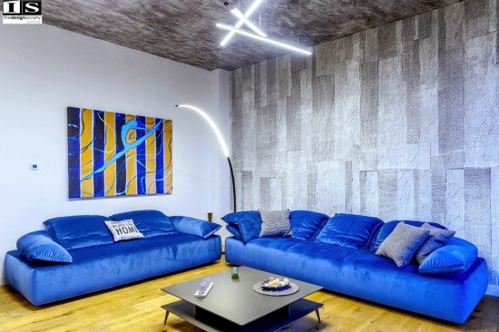 The living room – across – has blue shades and contrast colours – with a very modern furniture. The wallpaper in concrete tones, the ceiling in decorative dark paint balances the hole interior.