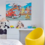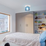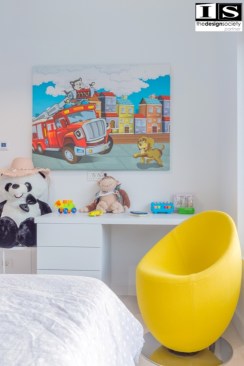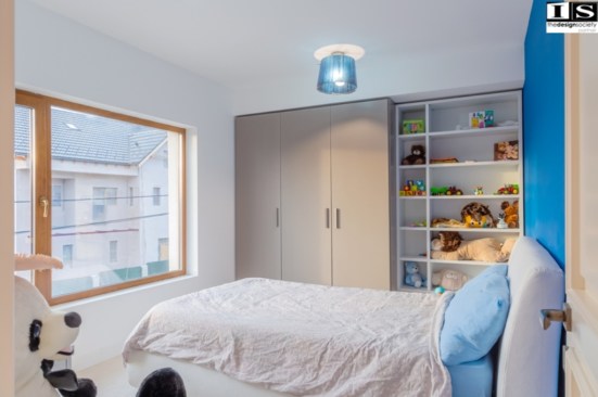 The second bedroom – is the child room – furnished in natural colours and whites. The contrast for this room is created by the dark-blue wall and the yellow used on the very modern and actual chair.