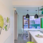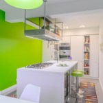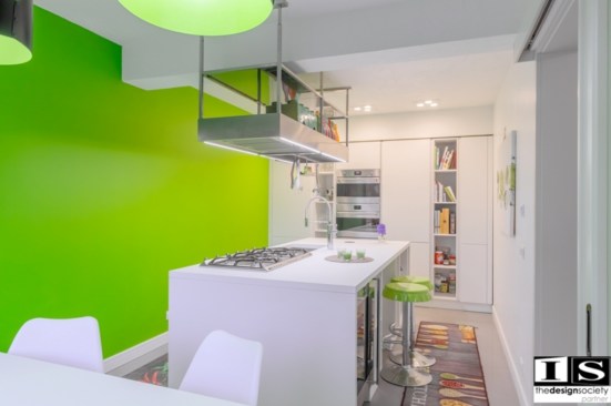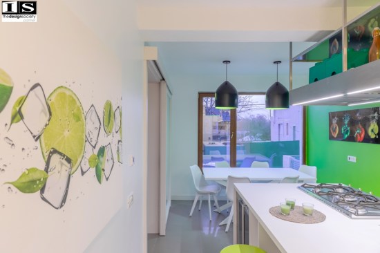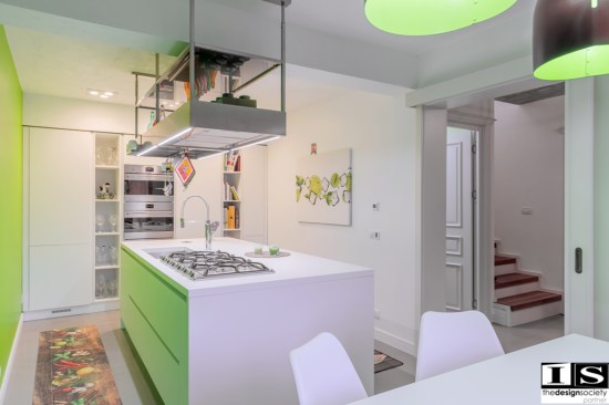 The ground floor presents a very modern kitchen – with white fenix furniture and a green wall for creating contrast in the room. The appliances choosen is professional – given the fact that the owners are passioned for cooking.
