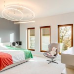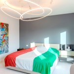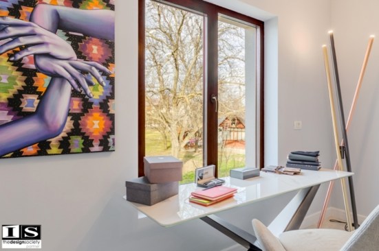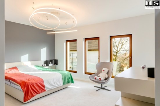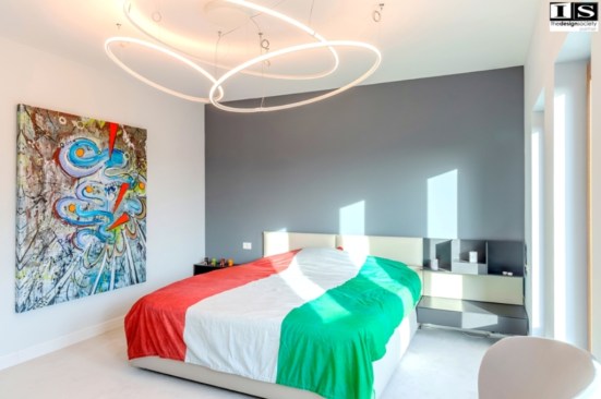 The master bedroom – with bathroom and dressing – is a very spacious room – keeping the modern and minimalist lines of the ground floor. The dark shade wall behind the bed is creating a very nice contrast with the creamy , natural leather, upholstery of the bed.