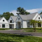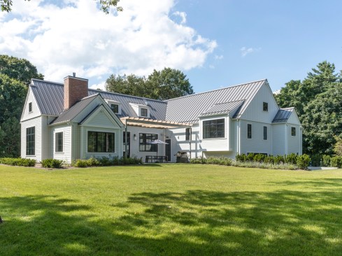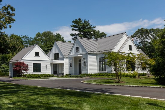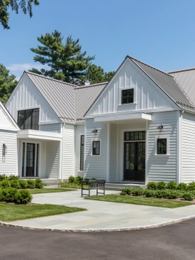 A young couple planning a family wanted their new home to be a healthful, engaging environment for young children, family and friends, with a strong connection to the outdoors. The architecture conveys a utilitarian spirit based on the humble aesthetic of barns, with white clapboard, black-framed divided windows, and metal roof.