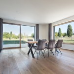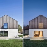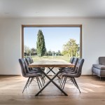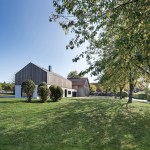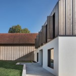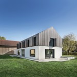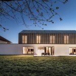 The house constructed by DIA – Dittel Architekten blends into the context of a historical country estate dating from the Middle Ages. The listed property is located in a rural setting in South Germany, which is characterized by natural areas and agricultural land. The new building is positioned orthogonally to the historical barn and to the road on the estate, so that it fits in with the alignment of the existing courtyard buildings. The architects also took into account the natural topography and the avenue driveway leading into the estate, which also stands within this geometric context. Constructed as an independent modern building, the new structure also respects the traditional architectural language of the surrounding buildings. Consideration was explicitly given to the homogeneity between old and new. This dialogue manifests itself in the horizontal division of the building structure, which is emphasized both by a difference in materials and a shadow gap. Brightly plastered, the modern base level forms the foundation for the wooden cube placed upon it, whose lamellar structure refers in modern translation to the neighboring barn. Thanks to the seamless integration of the folding shutters into the wooden lagging and the gables roof structure without eaves, the building presents itself as a modern, peaceful and closed monolith. In the twilight the semi-transparent lamellar structure of the shutters creates an atmospheric lighting mood and on hot days it supports the pleasant indoor climate without completely darkening the interior. The open floor plan ensures a bright, friendly living situation that opens up to the terrace flanking the building on two sides to the west and north. Panoramic windows provide an unobstructed view of the surrounding landscape, so that outside and inside, nature and living fluidly merge with one another.