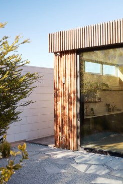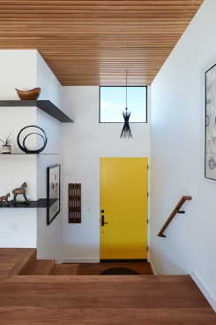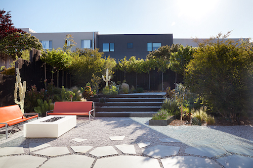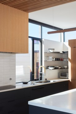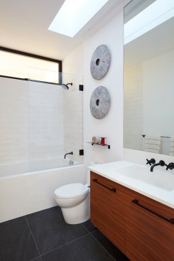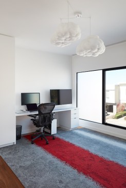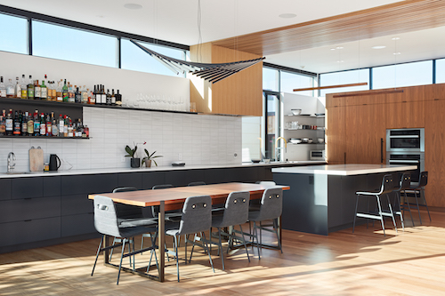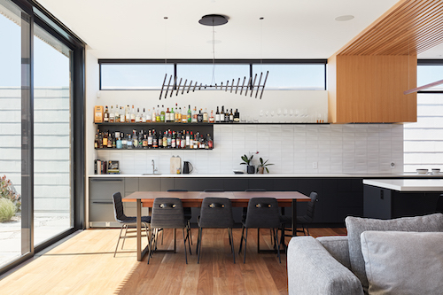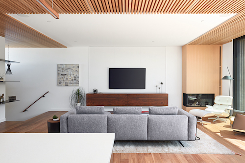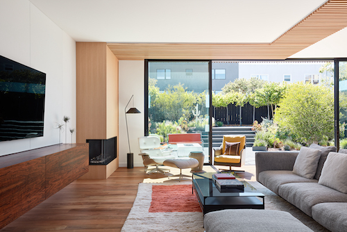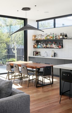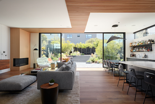 The homeowners lived in their San Francisco spec house for a few years before realizing it could be their forever home. Divided into smaller rooms, the traditional house was dark and compartmentalized. Instead, they wanted open, flowing spaces with lots of natural light streaming into the house. The homeowners were surprised when one of the conceptual designs presented a reverse floor plan, swapping the bedrooms to face the City and bay views at the street side of the house, and connecting the living spaces outward to the backyard. The new great room ended up as one large open volume. A linear batten system with integrated lighting systems floats along the ceiling, visually connecting while also defining the use areas within the space. With raised ceiling heights and large windows and glass sliding doors, the open and airy great room now extends out onto the new patio surrounded by lush landscaping to create one even larger indoor-outdoor room.