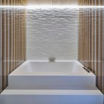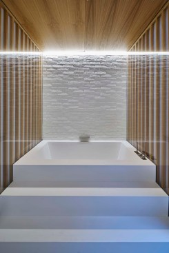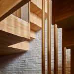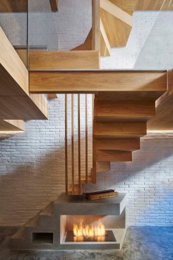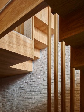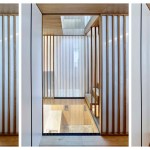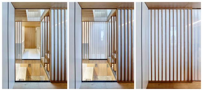 The detailing is exquisite, the warmth of the oak timber brings a tactile quality which is further enhanced by the sliding doors, which with an inner layer of rice-paper sets up illusionary views across the plan. The glass-floored light wells further enhance the illusion of depth and perspective as one moves vertically through the house. The white painted textured inner brick skin helps with the refraction of the light, adding to a kaleidoscope effect. This lining cleverly conceals many of the services.