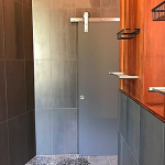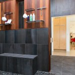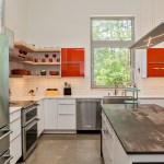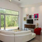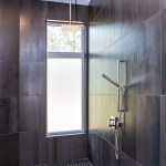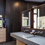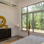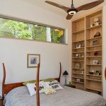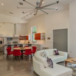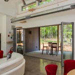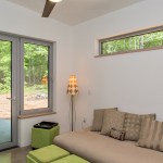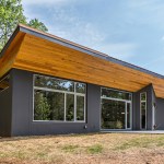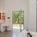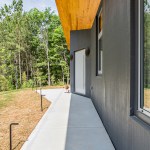 This modern, Net Zero-Net Positive house is a customized version of one of architect Arielle Condoret Schechter’s Micropolis® houses, a collection of small, modern, sustainable house plans she continues to design that can be purchased outright or customized to accommodate specific needs. Her clients, Cheryl and Ken Serdar, loved the original 950-square-foot Micropolis® plan she calls “Happy Family” but needed a bit more space. So Schechter enlarged it to 2222 heated square feet to include a spacious, spa-like master bathroom and a third bedroom that Cheryl will use for her office and jewelry-making studio. Originally from Texas, the Serdars were very clear about what they wanted for their new home in North Carolina’s Piedmont region: “very modern,” “extremely green,” and “almost industrial.” In form, function, and materials, the house is decidedly modern. The exterior walls are prefab concrete sandwich panels with built-in insulation made to Schechter’s specifications and brought to the site. The cypress soffit is a soft counterpoint to the concrete cladding and shields the interior from the high summer sun. The floors are polished cement for durability and sustainability. All windows and doors are manufactured by Awilux and certified for Passive House construction. The pivoting steel front door, sliding interior “barn doors,” and built-in closets, cabinets, and shelving throughout the house are modern space-saving ideas. Since the house is oriented to the south for maximum solar gain, extensive glazing provides the Serdars with an abundance of natural light and natural ventilation. In the central living space, Awilux casement windows are combined with a wall of folding doors that open the entire back of the area to the back porch, welcoming cool breezes inside during pleasant weather. All of those elements – orientation, deep roof overhang, prefab sandwich panels, Awilux windows and doors, natural lighting and ventilation — contribute to the house’s environmental sensitivity. Its Net Zero status takes it up to “extremely green.” To achieve that admirable level. Schechter also utilized: • A small solar array of 6 KW (all that was needed for this size house). • An abundance of under-slab insulation. • Seals on all air gaps. • An Energy Recovery Ventilator (ERV) for an extremely tight house. • A relatively compact footprint In fact, the Serdars’ modified Micropolis® house is the most energy-efficient residence Schechter has designed to date (and she’s designed many Net Zero/Net Positive houses). It has a HERS rating of -13, compared to the average American house’s very poor HERS rating of 100. Representatives from the independent rating company reported that this was the lowest/best rating they had ever seen. Along with the cement floors and aluminum-framed windows and doors, other details that give the house its “almost industrial” ambiance are the exposed ductwork, minimalist cabinetry, and the extra-large factory fan from Big Ass Fans®. Like their architect, the Serdars are passionate about animals and include cats in their household. For the felines’ pleasure, Schechter created a “cat staircase” of simple, natural wood steps that lead up to a 12-foot-high platform in the living area. Exploring Ideas: As Schechter was designing the master bath, she was “exploring ideas of what a luxurious bathroom can be,” she said, which supports her assertion that “smaller houses let you put your money toward better quality in materials and details rather than square feet.” The floor and walls of this elegant space are covered in large-scale black tile. A local artisan created a concrete trough double sink and Ipe wood composition All cabinets and drawers are built in and the “water closet” is obscured behind a barn door to provide privacy in an otherwise open space. The star of the space is the lighted shoe storage/display closet Schechter devised for Cheryl Serdar’s extensive collection of designer shoes. Schechter names her Micropolis® house plans for the inspirations they give her. She named this one “Happy Family” because she designed it to have two bedrooms on either end as private retreats with a central shared space between them where the homeowners are together. Schechter believes this plan offers “the type of spatial variety essential for a ‘happy family.’ “