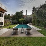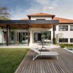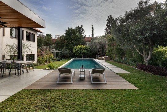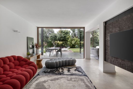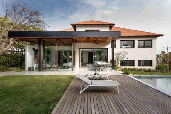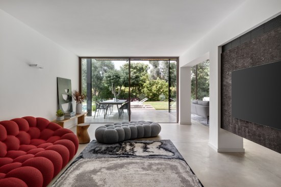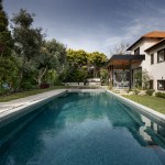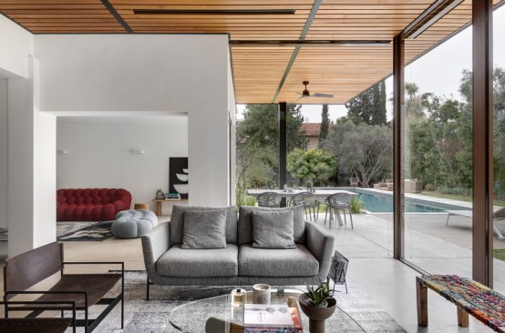 The outdoor space underwent a significant facelift, thanks to landscape designer Shai Yaffe, who worked in collaboration with Aronov. A large 40 sqm swimming pool was added, significantly upgrading the area, along with a fully equipped outdoor kitchen, a seating area for gatherings, a gazebo, and walking paths in the expanded garden. Large windows adorn the house and blur the boundaries between the interior and the exterior.