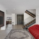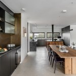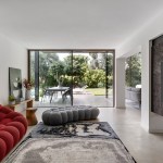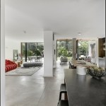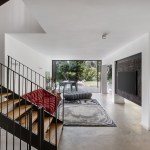 Although the original facade was maintained, it blends perfectly with the new extension. The entire property was decorated in a uniform colour, and a new large steel door was fitted, seamlessly integrating with the facade. Floating concrete steps lead to the front door and concrete casting characterizes the house creating a sense of space. A thin glass wall welcomes guests and offers a view of lush greenery from the beautiful rear garden.