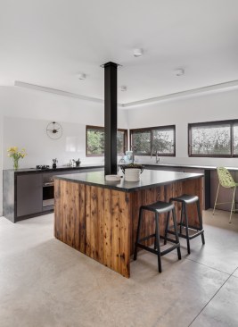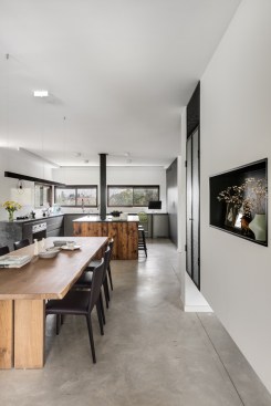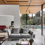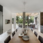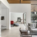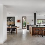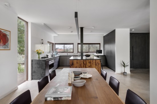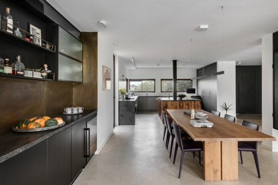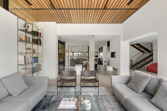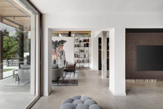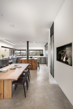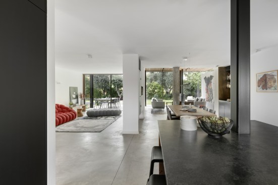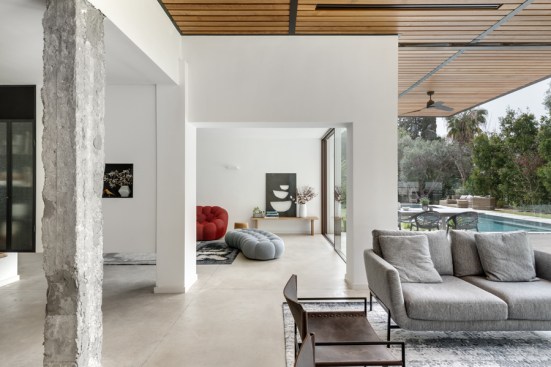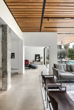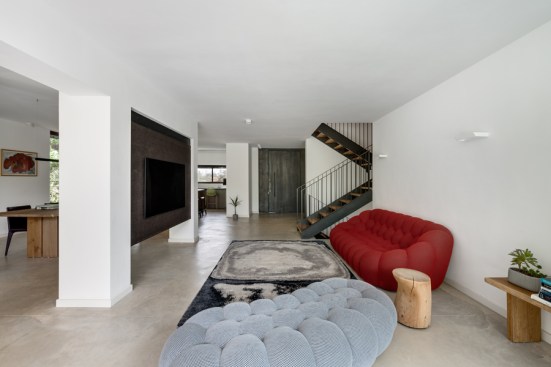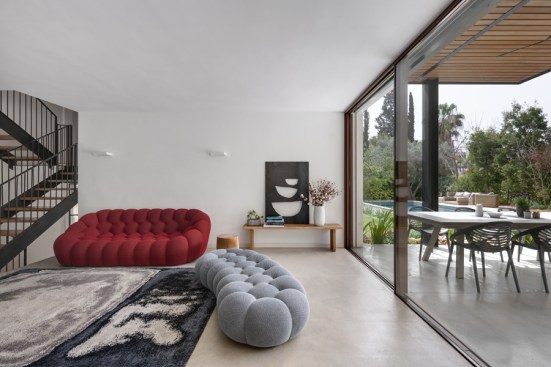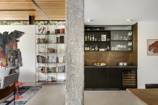 And so, it was done: the original façade was maintained as a daily reminder for the couple of where it all began. The goal, according to Aronov, was not to “escape” from the character of the original house, but to embrace it in a modern way. It was also decided to leave a concrete pillar from the original structure standing in its original place, between the living room and the dining area, serving as a nostalgic column that marks the spot where the old structure ended, and the new construction began.