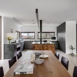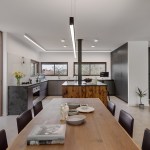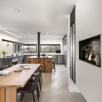 A wall-mounted television was positioned against the black cork living room wall, concealing the air conditioning system behind it. A new glossy charcoal-gray kitchen was designed with a range of concealed electrical appliances. The kitchen island was made of imported Douglas fir wood, chosen as a memento from the family’s years abroad. The clean-lined dining corner was fitted with a bar with designated space for wine bottles, glasses, etc., and the teak wood ceiling creates seamless continuity with the outdoor pergola.