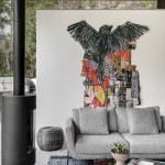 A white wall that seems freestanding, with a floating ceiling, was designed to add natural light and display art pieces. The chosen artwork is by an artist named DEDE, an internationally acclaimed Israeli artist, and it was sold under the condition that twice a year it is taken abroad to be displayed in various exhibitions. The creation is made of small details that are interconnected like fabric threads, creating a dominant artwork that was strategically positioned in the house to enjoy optimal daylight during the day.
