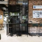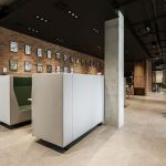 Due to this the interior has been left very raw – there are bricks, concrete and contrasting colors of white and red. At the same time there are wooden elements, which paired with plants warm up the ambiance of the space. Another element which influenced the architects was the profile of the company which commissioned the space. Stalgast is a company which produces, among others, restaurant furnishings and stainless steel accessories. Because of this the interior has been decorated with many steel elements such as the reception desk, wall panelings or the suspended ceiling. Moreover blue elements have been incorporated to reflect the color scheme of the companies logo. A meeting area was created with a comfortable seating area.