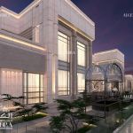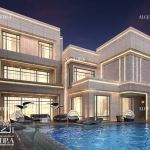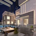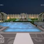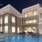 Luxury palace in modern style featuring a big outdoor swimming pool with loungers, patios on the ground and top floors.
