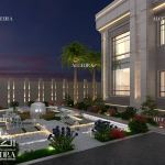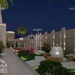 Front yard pergolas, lavish greenery with water fountains, and basketball court in the backyard.