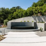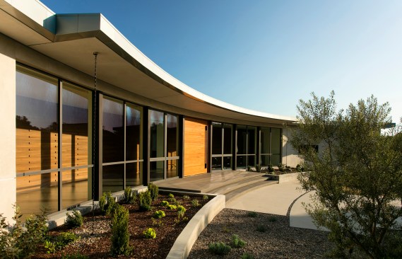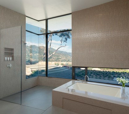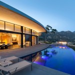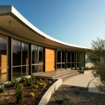 A series of guest rooms, the master suite and back-of-house elements act as bookends for a double-volume central pavilion containing the kitchen, living and dining rooms. The central living area connects to the outdoor terrace and infinity-edge pool through large, curved sliding doors; the view always the centerpiece. The house takes advantage of the natural topography by tucking the garage, wine cellar and mechanical spaces into the hillside, thus creating a low overall profile. A mono-slope roof follows the curve, reducing further any visual distraction. The carefully curated palette of stucco, steel and dark concrete in hushed earth tones completes the home’s connectivity to its environment.