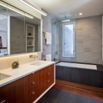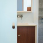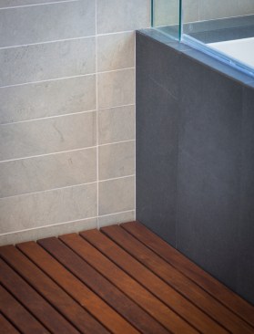Drawing on themes from the earlier project, Shoup and his clients chose a selection of products to bring warmth and texture to the space. A custom-designed ipe floor mat sits flush with the floor at the edge of the bathtub, while frosted glass panels work with lighting to maximize depth. To lend more weight to the space, Caesarstone didn’t just serve as the countertop material but as a full wrap for the vanity and medicine cabinets as well.