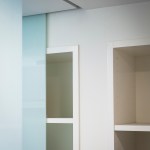 Contractor Stephen Shoup says that simplicity, clean lines, and continuity drove the design. To achieve that, the team removed door headers and created a continuous ceiling plane interrupted only by slots for sliding doors. Flush detailing of tile with drywall, and sliding glass doors that converge at an inside corner further highlight the precise alignment of materials and reveals throughout the space.