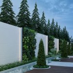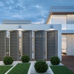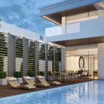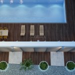Modern villa design in Dubai is a serenity oasis for its owners. Two floors villa surrounded by beautiful landscapes features a swimming pool and outdoor lounging area. Indoor area connected with the outdoor with sliding glass doors that gives a possibility for opening up and create a unified area, as well as letting in a lot of natural light inside the villa. An additional fence surrounds the pool area for more privacy. Designers used a lot of natural wood in exterior, in combination with greenery, landscape elements and water features by the boundary wall. This innovative design combines biophilic elements for the wellbeing of this villa owners.