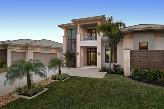 This modern yet warm home was designed for an unusual pie shaped lot that looked down a long waterway. The objective was to create a home that was different from the standard builder fare and incorporate sustainable building practices. The use of angled shape allowed for a full three car courtyard styled garage instead of typical front entry garages in this community. The builder utilized 92% exclusively American made products in the home.