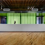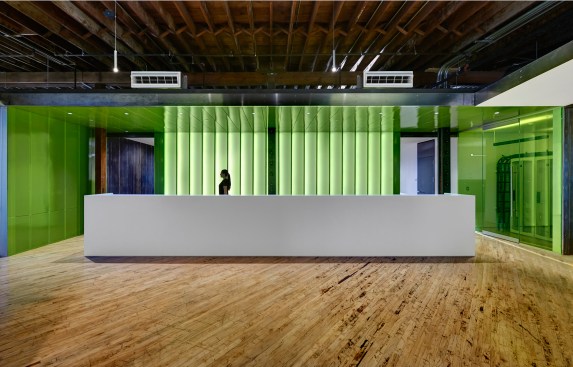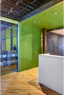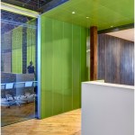 The firm’s corporate color is utilized as a carved void in the ‘island’ at the reception area. The green acrylic panels and laminated glass provide a bold and immediate delivery of the company brand. One recognizes immediately that this is not an ordinary engineering company.