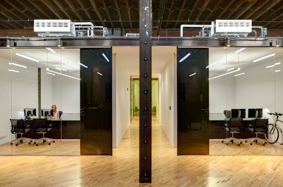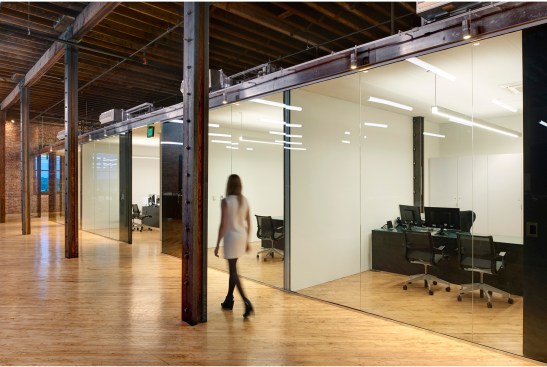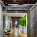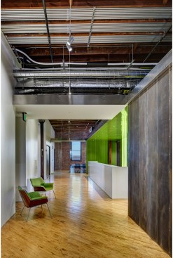 This engineering office is located on the third floor of a recently overhauled historic building in a burgeoning urban district. The building itself began operation in 1901 as an office and manufacturing facility. Now it is the state’s first commercial building that produces more energy than it consumes by leveraging a decentralized, fluid-based heating and cooling system, coupled with ground-source geothermal and photovoltaic panels located on the roof and on a shade canopy over an adjacent parking lot.