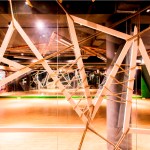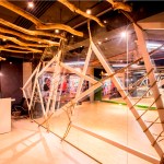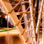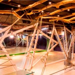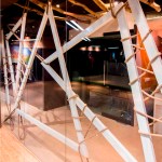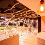 These triangulated, free standing frames are used in combination with the partitions and also on the ceilings, helping to provide a foothold for the light fixtures. They are interlaced with ropes, adding to the overall stability of the design and also helping to achieve a contemporary look.