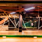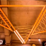 Triangulated and overlapping, these frames distinguish the design and give it a character, unlike most of the other fitness spaces. They are used not only in the interior elevations but also on the ceilings, providing a place to affix the light fixtures. These frames are crisscrossed with ropes, another unusual material.